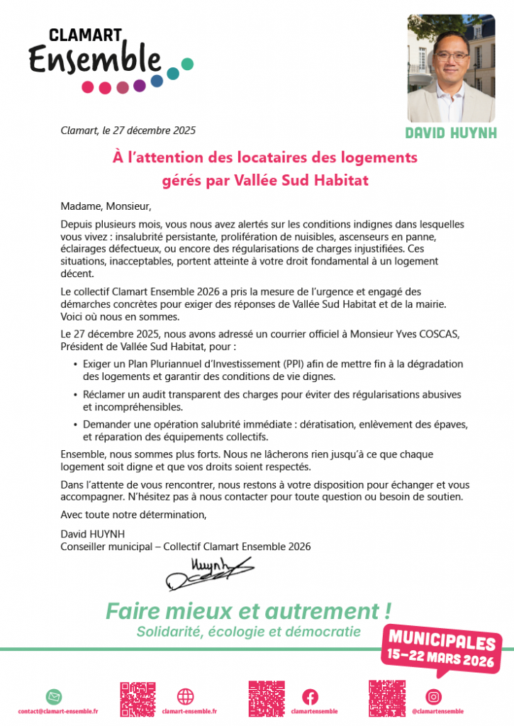 Alerté sur l’état dégradé de nombreux appartements et les difficultés matérielles des locataires, aggravées par des charges excessives et un manque de réponses, David Huynh, conseiller municipal d’opposition a interpellé le Président de Vallée Sud Habitat pour exiger des solutions face à cette situation.