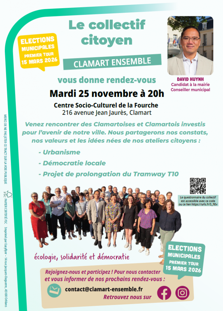 Le mardi 4 novembre David Huynh, candidat à la Mairie de Clamart pour les élections municipales des 15 et 22 mars prochains a présenté avec des membres du collectif citoyen Clamart Ensemble, la situation financière très inquiétante de la ville, la démarche d’association des Clamartois à la construction de notre projet ainsi que nos propositions pour relancer le commerce local…